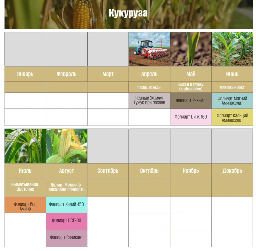 The most widely grown cereal grain in the world, it is widely used to produce flour, canned goods, starch, molasses, and other food products. Industrially, it is used as a raw material for producing alcohol, acetic acid, acetone, and dyes. Safe cultivation of agricultural crops requires understanding their characteristics, following basic planting and care rules, and monitoring at all stages of plant growth and development. Our agricultural calendar provides nutrition recommendations for various growth and vegetation phases.
